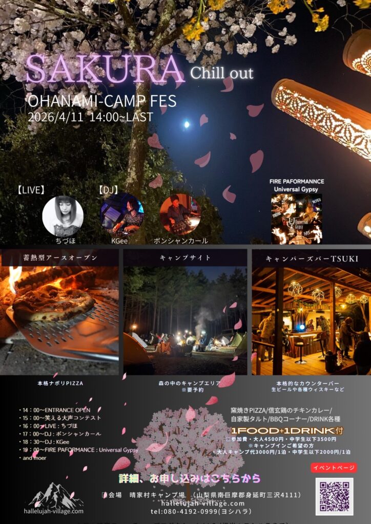 【4/11開催】桜×音楽×炎の絶景フェス!満開の桜の下、ライブやファイアショー、窯焼きピザを堪能。大声コンテストなど体験型企画も満載です。日帰りもキャンプ宿泊もOK!春の晴家村で最高の休日を。