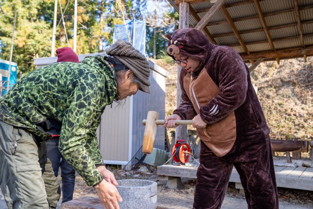 蒸した餅米を石臼でぺったんぺったん、交代でついていきます。